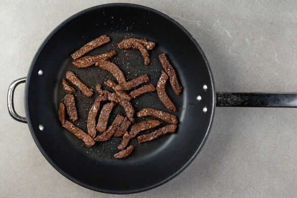 Das Fleisch trocken tupfen und in einer großen Pfanne mit 1EL Pflanzenöl bei starker Hitze 1–2Min. von allen Seiten scharf anbraten. Aus der Pfanne nehmen und beiseitestellen.