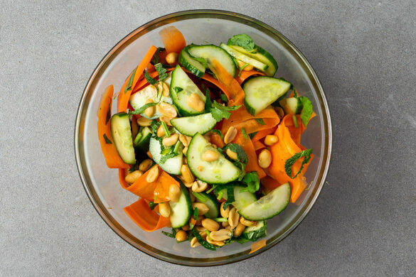 Die Minzeblätter von den Stängeln zupfen und fein schneiden. Den Koriander samt Stängeln fein schneiden. Die Karotten, die Gurken und die Erdnüsse mit der ½ der Kräuter und dem übrigen Limettensaft vermengen und den Salat mit je 1 Prise Zucker, Salz und Pfeffer abschmecken.