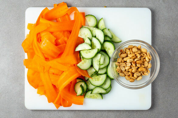 Die übrige Karotte ggf. schälen und mit einem Sparschäler in dünne Streifen schneiden. Die Gurke längs halbieren und quer in dünne Scheiben schneiden. Die Erdnüsse grob hacken.