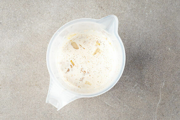 Die Walnusskerne in einer großen Pfanne ohne Zugabe von Fett bei mittlerer Hitze 1–2Min. anrösten. Vorsicht, sie werden schnell zu dunkel. Anschließend mit dem Violife Creamy und den Hefeflocken in ein hohes Gefäß geben. Den Knoblauch und die Schalotten in der Pfanne mit 1EL Olivenöl bei mittlerer Hitze ca. 1Min. anschwitzen und ebenfalls in das hohe Gefäß geben.