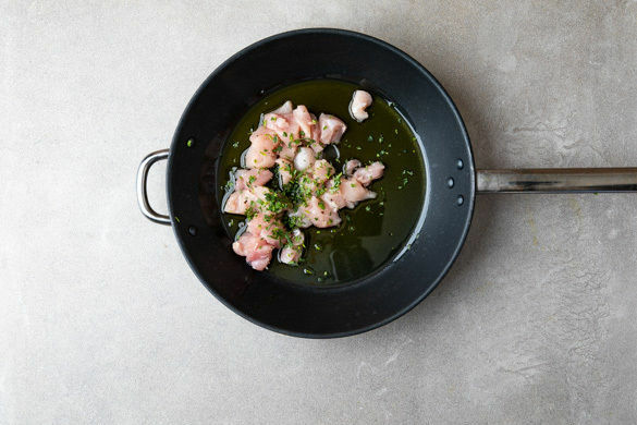Die ½ der Estragonblätter abzupfen und fein schneiden. Das Fleisch trocken tupfen und mit ⅓ des geschnittenen Estragons, je 1 Prise Salz und Pfeffer sowie 1EL Olivenöl vermengen. In einer mittelgroßen Pfanne bei mittlerer Hitze 3–4Min. von allen Seiten anbraten. Aus der Pfanne nehmen und beiseitestellen, die Pfanne aufbewahren.