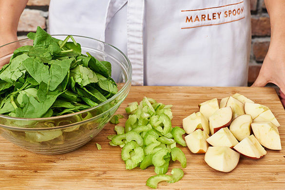 Den Spinat ggf. verlesen und grob schneiden. Den Sellerie in ca. 1cm breite Scheiben schneiden. Die Äpfel vierteln, entkernen und in ca. 2cm große Würfel schneiden.