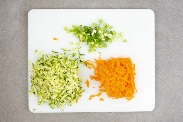 Die Zucchini mit einer Küchenreibe grob raspeln. Die Karotten ggf. schälen und ebenfalls grob reiben. Die Lauchzwiebeln in dünne Ringe schneiden.