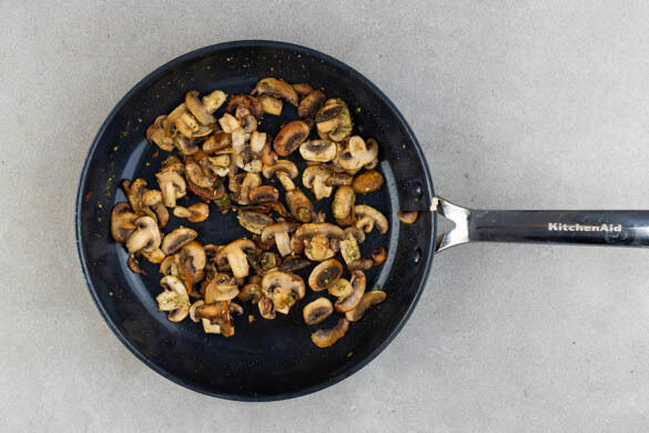 Die Pilze ggf. säubern und in dünne Scheiben schneiden. In zwei großen Pfannen mit je 1EL Butter und 1 Prise Salz bei mittlerer bis starker Hitze ca. 5Min. braten. Jeweils die ½ der Gewürzmischung unterrühren und ca. 1Min. weiterbraten. Die Pilze aus den Pfannen nehmen und in einem Sieb überschüssige Flüssigkeit abtropfen lassen. Eine Pfanne auswischen.