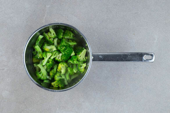 In einem kleinen Topf 300ml Wasser mit der ½ des Brühgewürzes oder mehr nach Geschmack zum Kochen bringen. Den Brokkoli in mundgerechte Röschen schneiden. Den Strunk ggf. schälen und in kleine Würfel schneiden. Den Brokkoli in der kochenden Brühe ca. 4Min. garen.