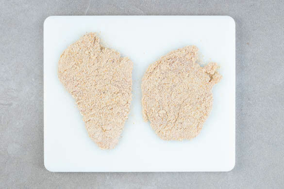 4EL Mehl mit 70ml Wasser, 2EL Senf und 1 kräftigen Prise Salz zu einem dickflüssigen Teig verrühren. Die Semmelbrösel auf einem Teller bereitstellen. Das Fleisch trocken tupfen und zwischen zwei Lagen Frischhaltefolie oder Backpapier mit einem Fleischklopfer zu ca. 1cm dicken Schnitzeln klopfen. Zum Panieren die Schnitzel zuerst im Teig, dann in den Semmelbröseln wenden.