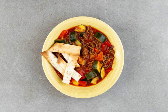 Eine kräftige Suppe mit kross gebackenen Tortillas ist zu jeder Jahreszeit ein Hit. Unser heutiges Exemplar mit Zucchini, Paprika, passierten Tomaten und saftigem Bio-Rinderhack ist einfach und schnell gemacht. Zwiebeln einlegen – ebenfalls kein Problem. Und die Tortillas sorgen im Ofen ohnehin praktisch für sich selbst. Ein rundum befriedigendes Essen.