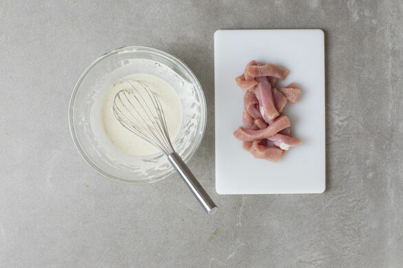 Die ½ der Gewürzmischung, 2TL Backpulver, 200g Mehl und 300ml lauwarmes Wasser mit einem Schneebesen zu einem zähflüssigen Teig verrühren und mit je 1 kräftigen Prise Salz und Pfeffer würzen. Das Fleisch trocken tupfen und in fingerlange Streifen schneiden.