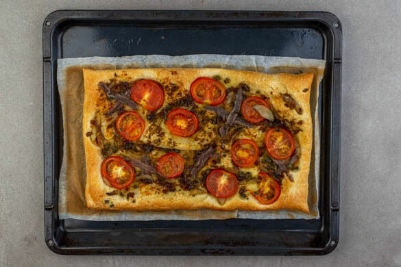 Ursprünglich stammt die Pissaladière aus Ligurien und ist so etwas wie die lokale Version der Pizza – das trägt sie sogar im Namen: Pizza all’Andrea, so die ursprüngliche Bezeichnung. Entlang der Küste verbreitete sie sich nach Frankreich, immer mit ähnlichem Konzept: Sardellen, Teig, gerne Zwiebeln. Wir nehmen heute Blätterteig, verfeinern mit Kapern und Tomaten und servieren dazu Romana mit Käse-Senf-Zitronen-Dressing. Mmh!