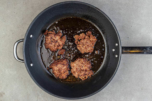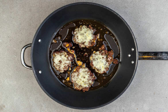 Die Pattys wenden, den Käse auf den Pattys verteilen und jeweils 2–3EL Wasser in die Pfannen geben, dann abgedeckt 2–3Min. weiterbraten, bis das Fleisch durch und der Käse geschmolzen ist.