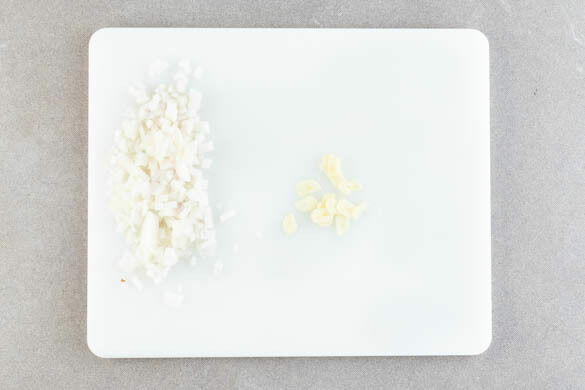 Die Zwiebeln schälen, halbieren und in feine Würfel schneiden. Den Knoblauch schälen und in dünne Scheibchen schneiden.