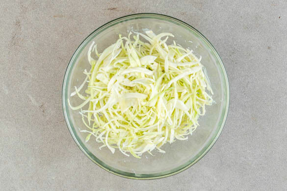 Die Limette halbieren und auspressen. Den Weißkohl mit 2EL Mayonnaise, der ½ des Limettensaftes, je 1 kräftigen Prise Salz und Pfeffer und 1 Prise Zucker vermengen. Beiseitestellen.