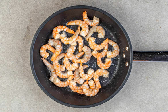 Die Garnelen in einem Sieb mit kaltem Wasser abspülen, dann trocken tupfen. In einer mittelgroßen Pfanne mit 1EL Pflanzenöl bei mittlerer Hitze ca. 2Min. anbraten.