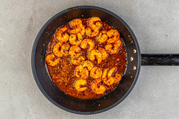 Je 1 Prise Salz und Pfeffer, ½EL Butter, den Ahornsirup, die Sojasauce und die ½ der Chilipaste in die Pfanne geben und die Garnelen in der schaumigen Butter ca. 2Min. weiterbraten, bis sie gar sind. Während der letzten ca. 30Sek. die ½ der Gewürzmischung hinzugeben.
