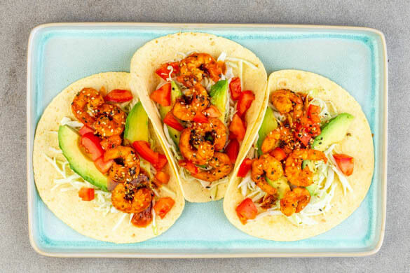 Tacos sind wirklich sehr vielseitig. Alles kann, nichts muss, was bedeutet, dass man die Minitortillas mit unzähligen Zutaten belegen kann und soll. Heute haben wir uns einen köstlichen Crossover ausgedacht: Die Garnelen baden zunächst geschmeidig in einem Mix aus Ahornsirup, Sojasauce und Chilipaste. Dazu gibt es einen limettigen Coleslaw, fruchtige Tomaten und Avocado. Eine Geschmacksfusion, die dich auf Hochtouren bringt.