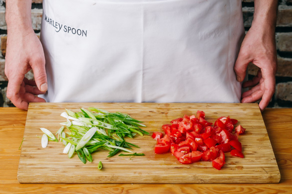 Inzwischen die Lauchzwiebel schräg in feine Ringe schneiden. Die Tomate in kleine Würfel schneiden, dabei den Strunk entfernen.