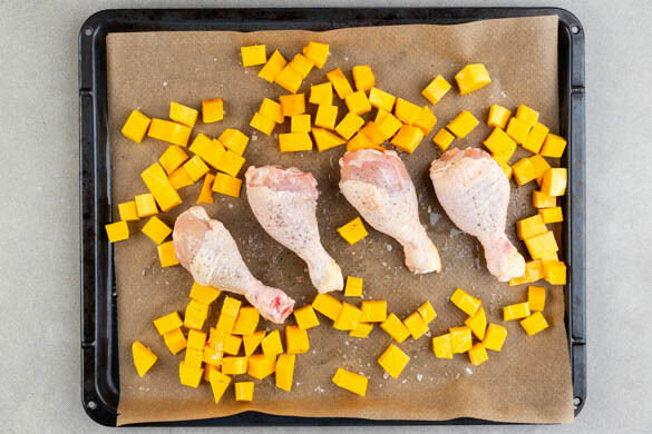 Den Backofen auf 240°C (220°C Umluft) vorheizen. Die Kürbisse schälen, mit einem Löffel entkernen und in 1–2cm große Würfel schneiden. Die Drumsticks trocken tupfen und mit dem Kürbis auf ein mit Backpapier ausgelegtes Backblech geben. Mit 2EL Pflanzenöl beträufeln, mit ½TL Salz würzen und ca. 10Min. auf der mittleren Schiene backen.
