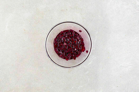 4EL hellen Essig mit 1TL Zucker und 1 kräftigen Prise Salz verrühren. Die Rote Bete schälen, in kleine Würfel schneiden und mit dem Essig vermengen. Bis zum Servieren beiseitestellen. Tipp: Da Rote Bete stark färbt, beim Verarbeiten am besten Küchenhandschuhe und Schürze tragen.