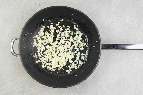 Die Zwiebeln in einer großen Pfanne mit 2EL Pflanzenöl und 1 kräftigen Prise Salz bei starker Hitze 1–2Min. glasig anbraten.