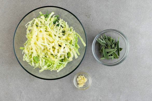 Den Wirsing halbieren und eine Hälfte in feine Streifen schneiden, dabei den harten Strunk entfernen. Die übrige Hälfte für ein anderes Rezept aufbewahren. Die Thymianblätter von den Stängeln zupfen. Den Knoblauch schälen, durch eine Knoblauchpresse drücken oder sehr fein würfeln.