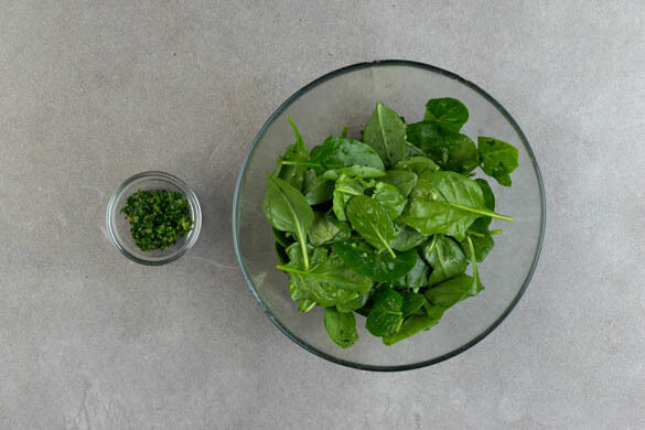 Die Zitronenschale abreiben, die Zitrone halbieren und auspressen. Die Petersilie samt Stängeln fein schneiden und mit der Zitronenschale und dem restlichen Knoblauch zu einer Gremolata vermengen. 1EL Zitronensaft, 1EL Olivenöl sowie je 1 Prise Salz und Pfeffer verrühren und mit dem Spinat und der ½ der Gremolata vermengen.