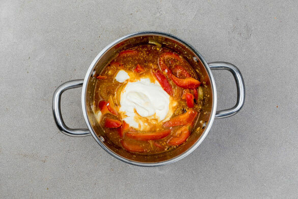Die Zwiebeln in einem mittelgroßen Topf mit 1EL Pflanzenöl bei mittlerer bis starker Hitze 1–2Min. anschwitzen. Die Paprika, die Tomaten und den Knoblauch hinzufügen und kurz mitbraten. Inzwischen die ½ der Currypaste mit 1EL Pflanzenöl und 1 kräftigen Prise Salz verrühren. Die übrige Currypaste wird für dieses Rezept nicht benötigt.