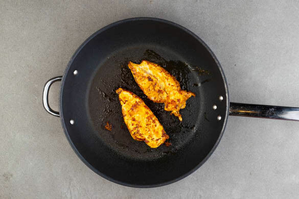Das Fleisch trocken tupfen, jeweils horizontal in 2 dünne Schnitzel schneiden und mit der übrigen Currypaste vermengen. Dann in einer großen Pfanne bei mittlerer Hitze auf jeder Seite 2–3Min. braten, bis das Fleisch durch ist.
