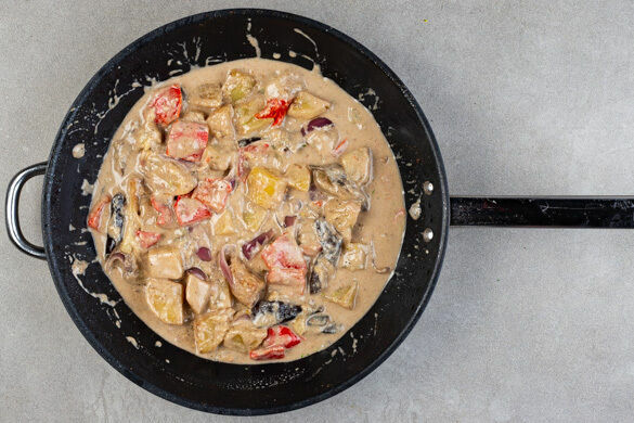 Die Kartoffeln schälen und in ca. 2cm große Stücke schneiden. Die Paprika vierteln, entkernen und in dünne Streifen schneiden. Mit den Kartoffeln und den Auberginen in eine Auflaufform geben und das Fleisch darauflegen. Die Gewürze in der Pfanne mit der Kokosmilch, der Fischsauce, 1EL hellem Essig und 300ml Wasser verrühren und über das Gemüse geben.