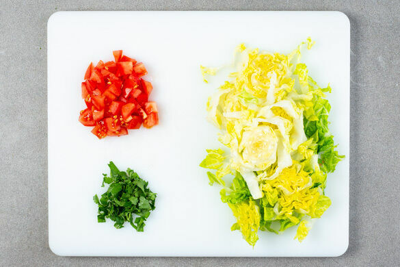 Den Salat in dünne streifen schneiden, dabei den Strunk entfernen. Die Tomate in kleine Würfel schneiden. Den Koriander samt Stängeln fein schneiden.