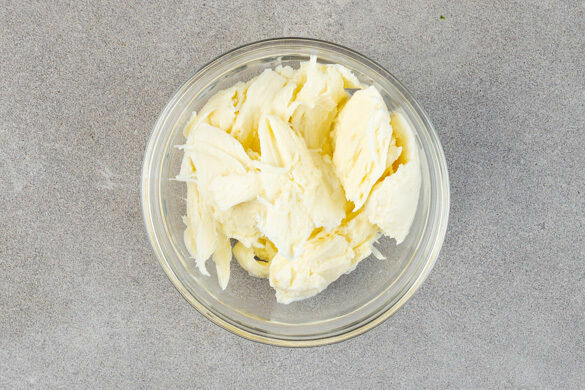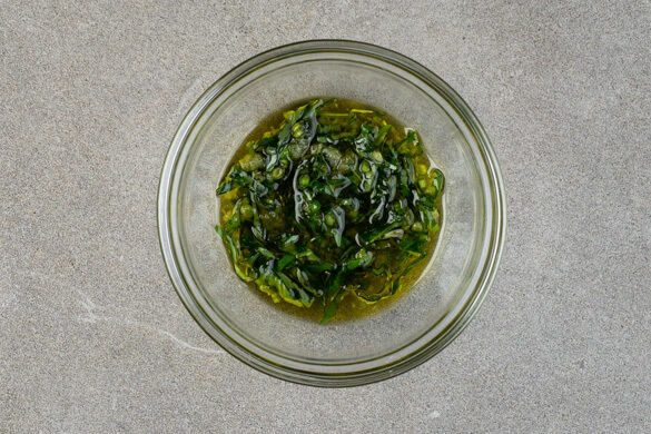Einige Basilikumblätter von den Stängeln zupfen und für die Garnitur beiseitelegen, das übrige Basilikum samt Stängeln fein schneiden. Die restlichen Knoblauchscheibchen fein würfeln und mit dem geschnittenen Basilikum, 4EL Olivenöl und 1 Prise Salz verrühren.