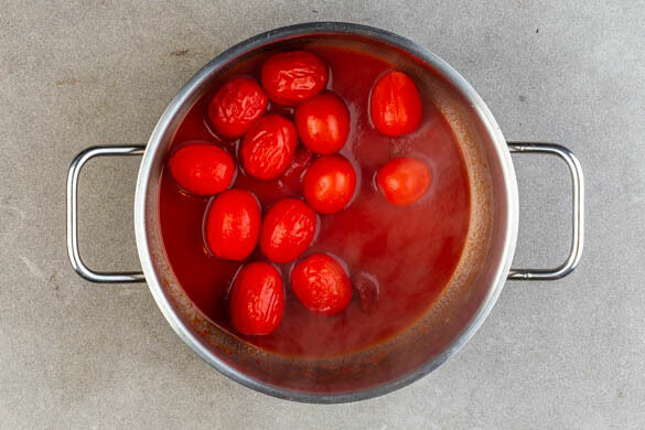 In einem mittelgroßen Topf ausreichend gesalzenes Wasser für die Pasta zum Kochen bringen. Die Tomaten, ½TL Chiliflocken, die ½ des Tomatenmarks und 100ml Wasser in einem zweiten Topf bei mittlerer bis starker Hitze ca. 4Min. abgedeckt kochen, bis die Tomaten weich werden.