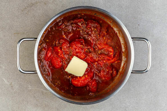 Den Deckel abnehmen, die Gewürzmischung zu den Tomaten hinzufügen und die Tomaten mit einer Gabel zerdrücken. Dann bei mittlerer bis starker Hitze noch ca. 4Min. kochen, bis eine sämige Sauce entsteht. Vom Herd nehmen und 1EL Butter und 1 kräftige Prise Salz unterrühren.