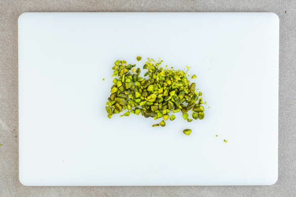 Die Pistazien mit einer schweren Pfanne grob zerdrücken. Tipp: Ein kleines Loch in den Beutel schneiden, damit die Luft entweichen kann und die Pistazien im Beutel zerdrückt werden.