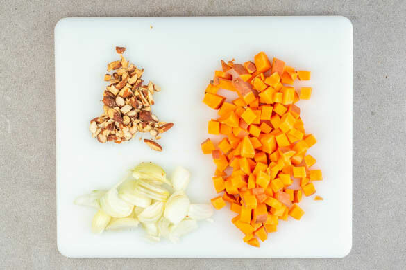Die Süßkartoffeln samt Schale in mundgerechte Stücke schneiden. Die Zwiebeln schälen, halbieren und in dünne Scheiben schneiden. Die Rauchmandeln mit einer schweren Pfanne oder einem Fleischklopfer in grobe Stücke zerdrücken. Tipp: Ein kleines Loch in den Plastikbeutel schneiden, damit die Luft entweichen kann, und die Mandeln im Beutel zerdrückt werden.