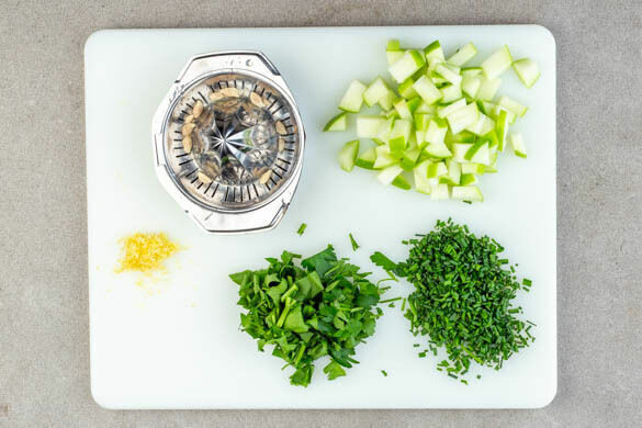 Die Zitronenschale abreiben, dann die Zitrone halbieren und auspressen. Die Äpfel vierteln, entkernen und in kleine Würfel schneiden. Den Schnittlauch und die Petersilie samt Stängeln grob schneiden.