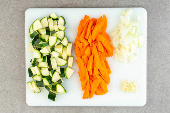 Den Knoblauch schälen und in feine Scheibchen schneiden. Die Zwiebel schälen, halbieren und in dünne Ringe schneiden. Die Karotte ggf. schälen und schräg in dünne Scheiben schneiden. Die Zucchini längs vierteln und in ca. 0,5cm breite Stücke schneiden. Die Oliven grob hacken.