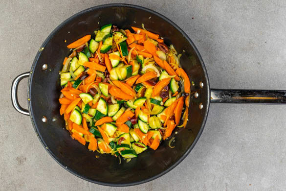 Die Karotten mit 1EL Olivenöl in einer mittelgroßen Pfanne bei mittlerer Hitze 2–3Min. anbraten, dann die Zucchini zugeben und 2–3Min. mitbraten, bis das Gemüse anfängt weich zu werden. Die Zwiebeln, den Knoblauch und die Oliven zugeben und 2–3Min. mitbraten, bis die Zwiebeln glasig sind.