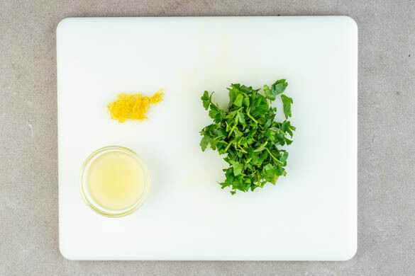 Die Zitronenschale abreiben, dann die Zitrone halbieren und auspressen. Die Petersilie samt Stängeln grob hacken. Den Eintopf mit ½EL Zitronenschale und ½EL Zitronensaft würzen. Mit ggf. mehr Zitronensaft und -schale sowie Salz und Pfeffer abschmecken.