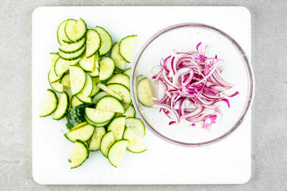 Die Zwiebeln schälen, halbieren und in feine Streifen schneiden. Die Zwiebeln mit 2EL Essig, 2TL Zucker und 1TL Salz vermengen. Die Gurke längs halbieren und quer in dünne Scheiben schneiden.