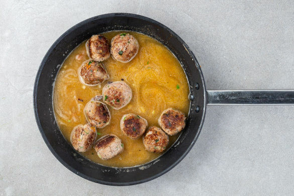 1EL Mehl in die Pfanne geben und gut mit dem Bratensatz verrühren. Dann 1EL Ketchup und die ½ des Brühgewürzes dazugeben, die Hackbällchen samt ausgetretenem Bratensaft in die Pfanne legen und ca. 300ml Wasser angießen. Die Sauce 3–4Min. bei mittlerer Hitze sanft köcheln lassen.