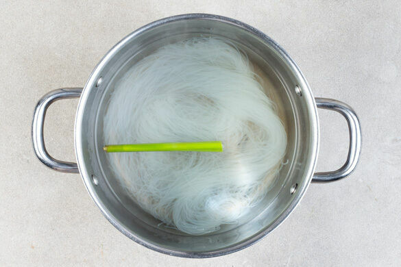 In einem mittelgroßen Topf ausreichend gesalzenes Wasser für die Nudeln aufkochen. Das Zitronengras flach klopfen, 2cm Zitronengras am weißen Ende abschneiden und beiseitelegen. Das übrige Zitronengras und die Nudeln ins kochende Wasser geben, den Topf vom Herd nehmen und die Nudeln in 3–5Min. gar ziehen lassen. In ein Sieb abgießen, kalt abschrecken und abtropfen lassen.