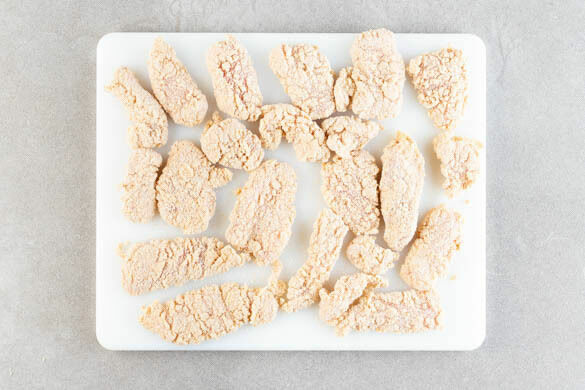 4EL Mehl und 60–70ml kaltes Wasser zu einem glatten, dickflüssigen Teig verrühren und mit 1 Prise Salz würzen. Das Fleisch trocken tupfen und in mundgerechte Stücke schneiden, dann in den Teig eintauchen und anschließend in den Semmelbröseln wenden, bis es rundum gut bedeckt ist.