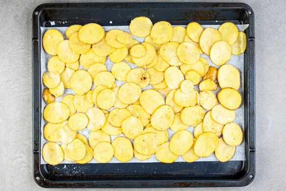 Den Backofen auf 240°C (220°C Umluft) vorheizen. Die Kartoffeln samt Schale in feine Scheiben schneiden und mit der ½ des 5-Gewürze-Pulvers, 2EL Pflanzenöl und 1TL Salz auf einem mit Backpapier ausgelegten Backblech vermengen. Die Kartoffeln gleichmäßig verteilen und 18–22Min. im Ofen goldbraun backen. Anschließend bei geöffneter Ofentür abkühlen lassen, damit sie knusprig werden.