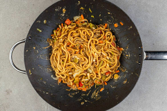 Den Gemüsemix in derselben Pfanne mit 2EL Pflanzenöl bei starker Hitze ca. 2Min. anbraten, bis das Gemüse anfängt weich zu werden. Die Nudeln zugeben und 3–4Min. mitbraten, dabei gelegentlich umrühren. Mit 1TL Salz und 1 kräftigen Prise Pfeffer würzen.