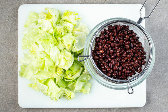 Die ½ des Eisbergsalats in grobe Streifen schneiden. Der übrige Salat wird für dieses Rezept nicht benötigt. Die Bohnen in einem Sieb mit kaltem Wasser abspülen und abtropfen lassen.