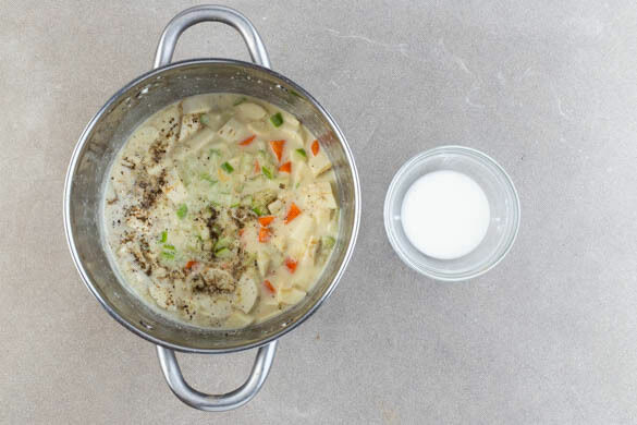 Die Pastinaken, die Karotten und die ½ der Apfelwürfel in die Suppe geben und 8–10Min. mitköcheln lassen, dann mit Salz und Pfeffer abschmecken. Die Stärke mit 4–5EL kaltem Wasser verrühren und in die Suppe rühren. Die Suppe zum Binden noch ca. 1Min. kochen lassen.