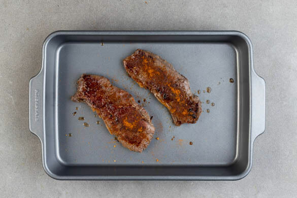 Das Fleisch in eine kleine Auflaufform geben, mit dem Bratensaft beträufeln und mit der Gewürzmischung bestreuen. Im unteren Teil des Ofens 5–10Min. weitergaren, je nachdem, ob es medium oder durch sein soll. Den Knoblauch vom Backblech nehmen. Das Gemüse 5–7Min. weiterbacken, bis es appetitlich gebräunt ist.