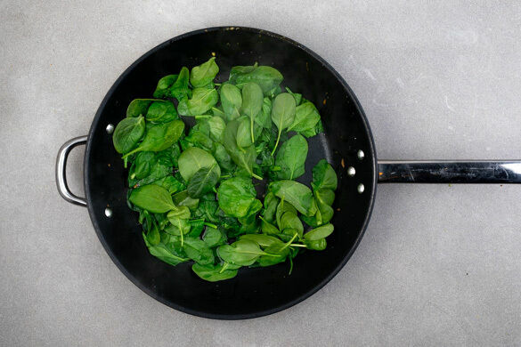 Den Spinat in derselben Pfanne 5–8Min. anbraten, bis er zusammengefallen ist. Ggf. etwas Wasser hinzugeben. Den Spinat anschließend in einer Schüssel mit dem restlichen Sesamöl vermengen. Die Pfanne aufbewahren.