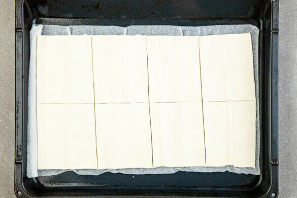 Die Teige mit dem Papier nach unten auf zwei Backblechen ausrollen und jeweils einmal längs und dreimal quer einschneiden, um insgesamt 16 gleich große Teigstücke zu erhalten.