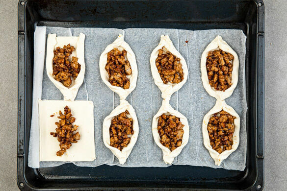 Das Hackfleisch auf die Teigstücke aufteilen, die Pfanne wird weiterverwendet. Die Teigstücke an den langen Seiten etwas aufrollen und an den kurzen Seiten zusammendrücken, sodass Boote entstehen. Die Boote im vorgeheizten Ofen 15–20Min. backen, bis der Teig knusprig und goldbraun ist. Je nach Ofentyp die Position der Bleche nach der Hälfte der Zeit tauschen.